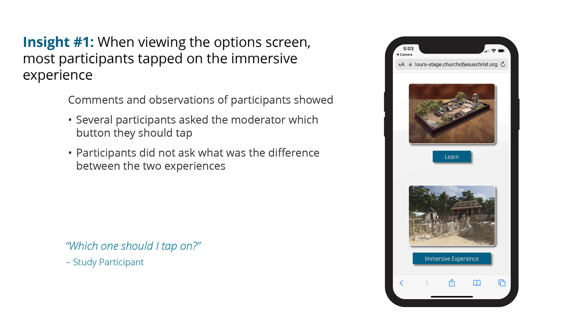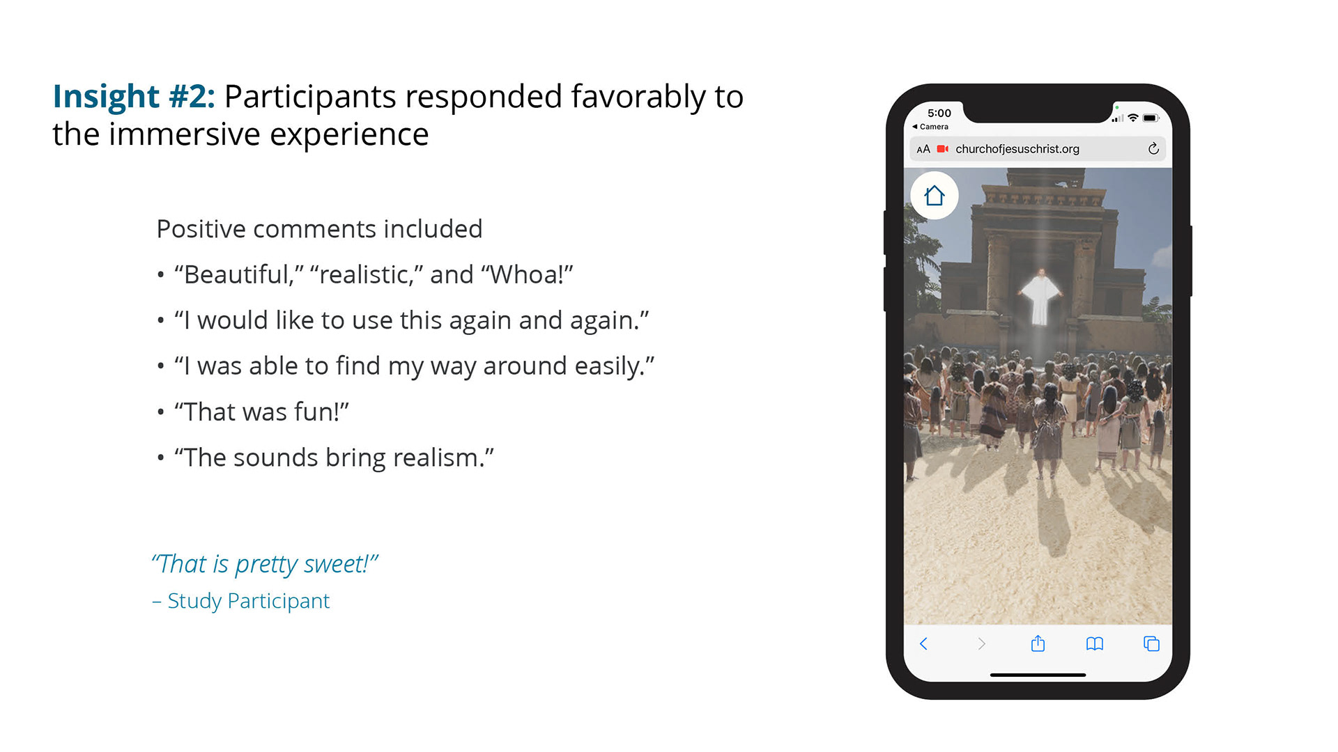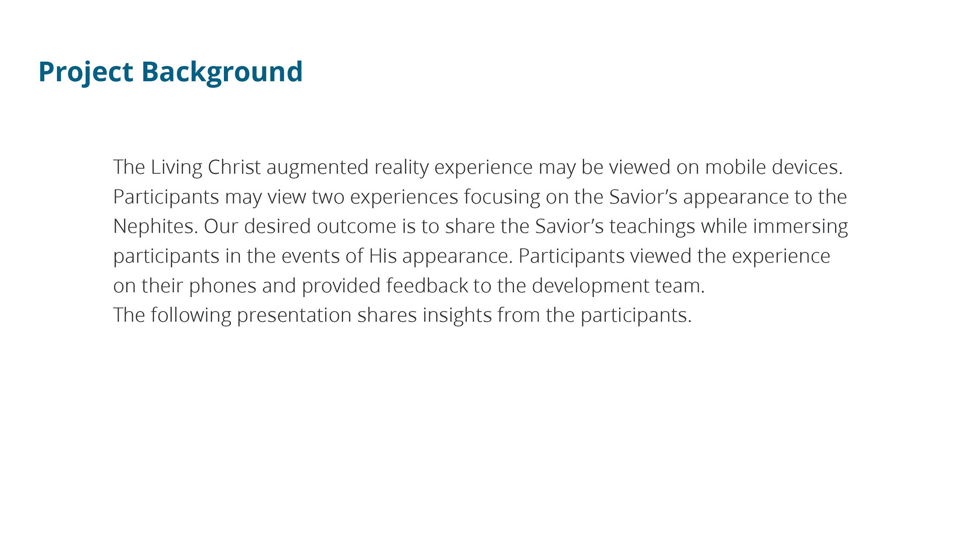 The Living Christ augmented reality (AR) experience is an interactive mobile application that immerses users in scriptural events depicting the Savior’s appearance to the Nephites. Before release, the client requested a round of user testing to evaluate usability, engagement, and narrative comprehension. As the project manager, I coordinated the testing process between the vendor and the client, overseeing participant recruitment, observation setup, and post-test analysis.