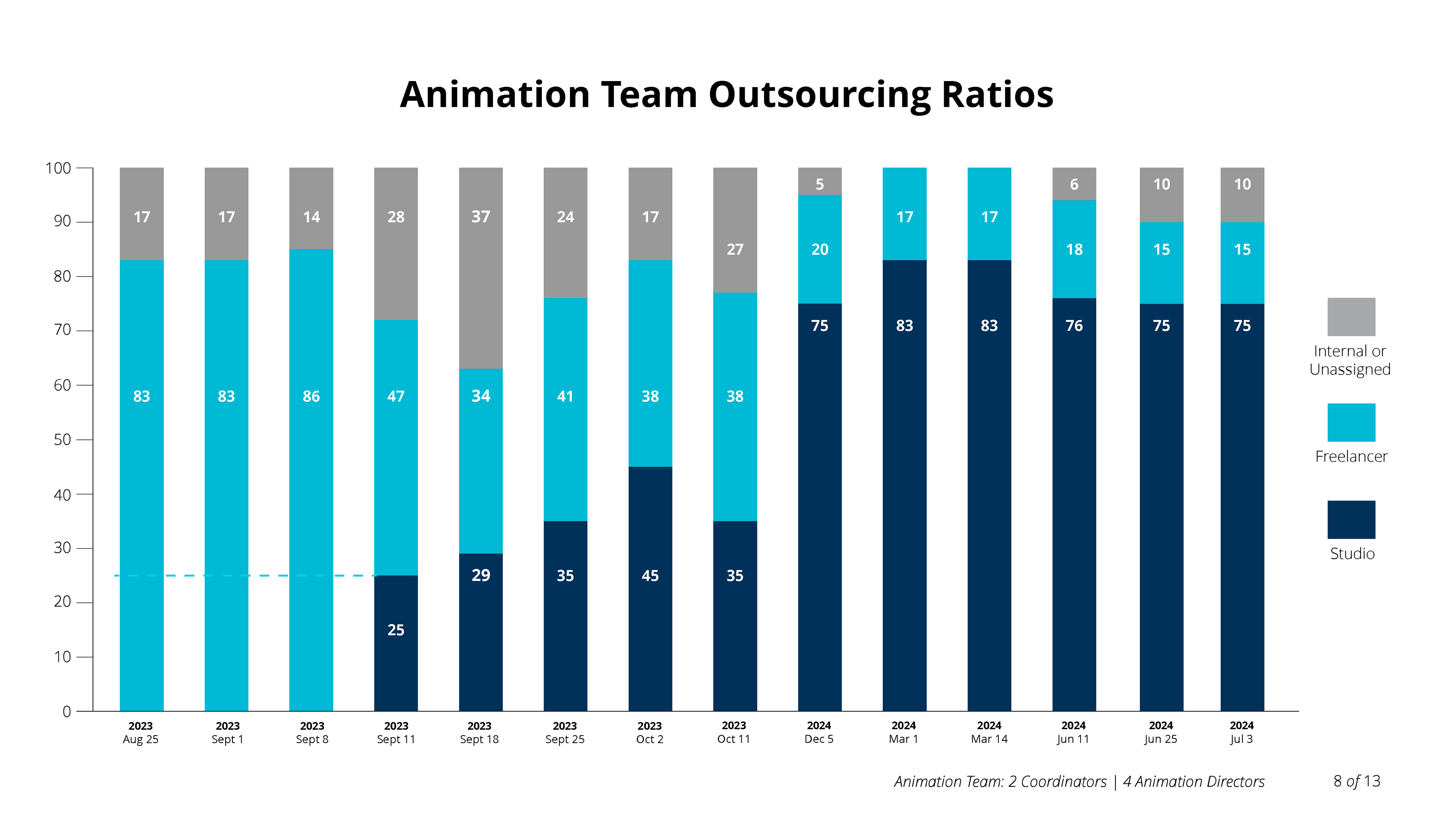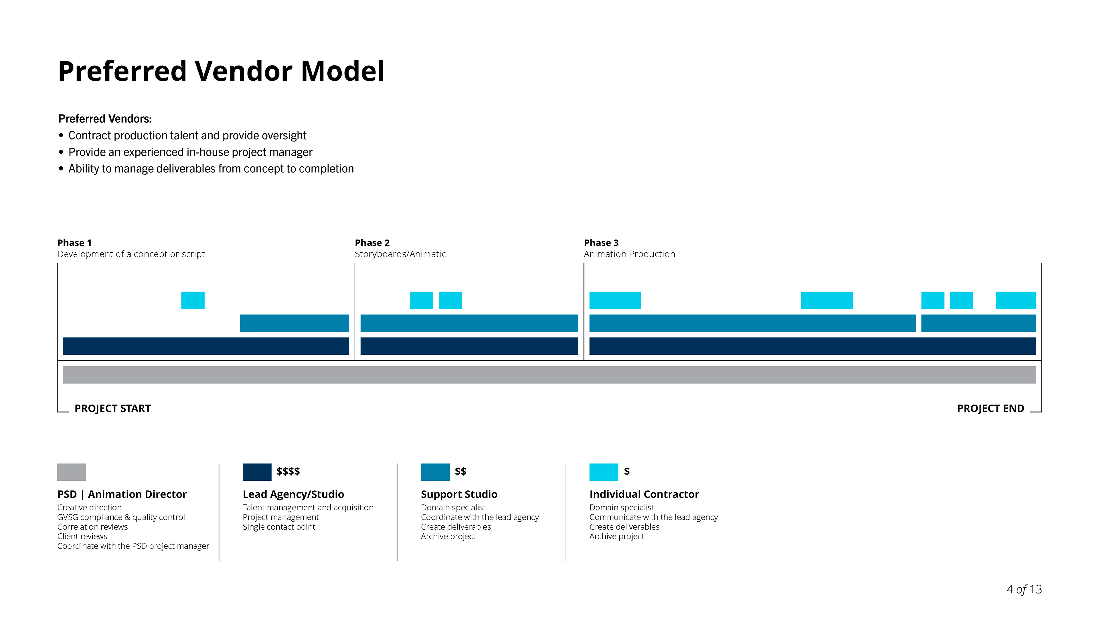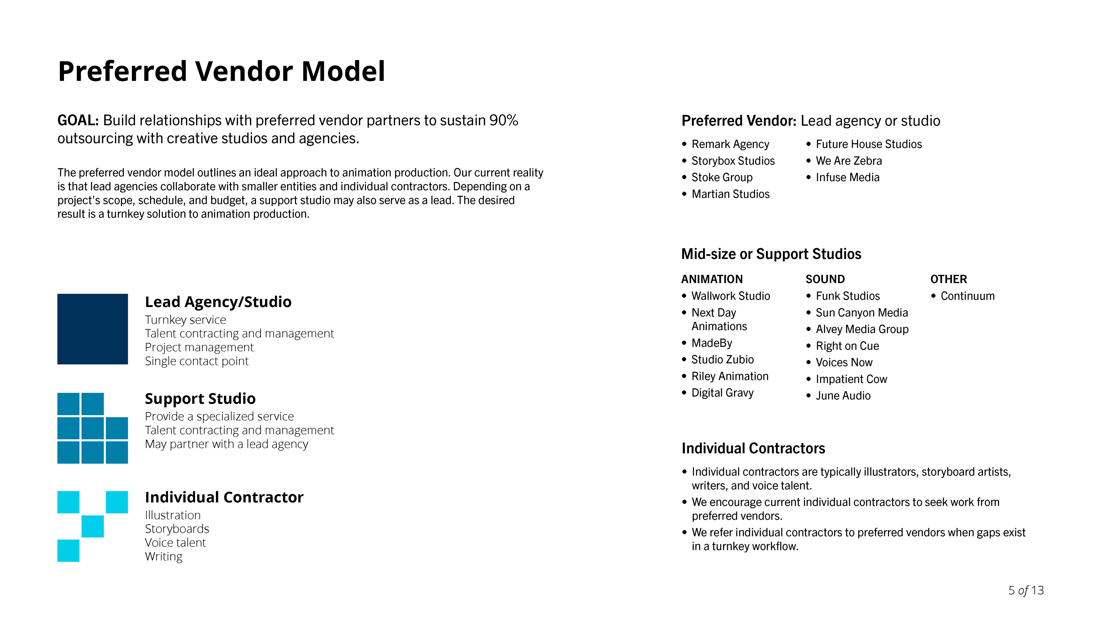 The Team Outsourcing Strategy outlines a multi-year operational plan for establishing a sustainable network of preferred creative partners. The goal was to evolve from an internal production model to a distributed, vendor-driven ecosystem capable of scaling high-quality animation and motion design projects while maintaining institutional standards.